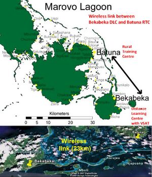 To provide connectivity, a wireless link is being established between Bekabeka DLC and Batuna Rural Training Centre (RTC). The geography is suitable for wireless networking with villages scattered around the lagoon-side with good lines of sight.
