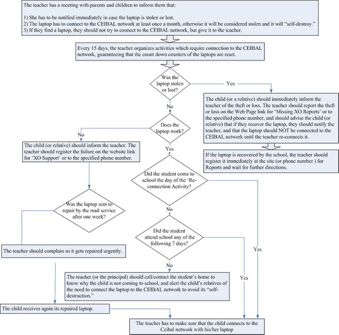 Meetings with the parents must be organized by the school principal. In these meetings, the parents are told about the CEIBAL project, the responsibility that they have to exercise, together with their child, to take care of the machine, and of the laptop malfunctions that can be avoided with proper care. They are also given a break down of the high, medium, or low cost of repairs in relation to degrees of damage, as well as corresponding ways of preventing each kind of damage. Parents also receive a flow chart called “Procedure Map” (see Illustration 7: Procedure Map) of what to do in case the laptop is stolen, lost, not used for more than 7 days, or de-activated, as well as what to do if somebody else’s laptop is found. The Call Center number is 08002342.