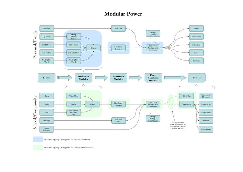 - Two different schools may both require power, but exist in two very different environments. One has regular strong winds, and the other has a fast moving river near by. To get the most reliable power solution possible both schools require the power regulator and generator, but should select different mechanical modules - the blades for wind and the water wheel for the river. Because both schools are purchasing 2 identical modules the cost will go down due to economies of scale, but because they have different mechanical modules they are still getting a custom power solution.