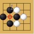 Players are not allowed to make a move that returns the game to the position before the opponent's last previous move. This rule, called the ko rule, prevents unending repetition.<ref>Sensei's Library. "Ko". Archived from the original. Template:Citation error. http://senseis.xmp.net/?Ko. Retrieved on 2007-12-20. </ref> See the example to the right: Black has just played the stone marked 1, capturing a white stone at the intersection marked with a circle. If White were now allowed to play on the marked intersection, that move would capture the black stone marked 1 and recreate the situation before Black made the move marked 1. Allowing this would result in an unending cycle of captures by both players. The ko rule therefore prohibits White from playing at the marked intersection. Instead White must play elsewhere; Black can then end the ko by filling at the marked intersection, creating a five-stone Black chain. If White wants to continue the ko, she will try to find a play that Black must answer; if Black answers, then White can retake the ko. A repetition of such exchanges is called a ko fight.<ref>Sensei's Library. "Basics On Ko's". Archived from the original. Template:Citation error. http://senseis.xmp.net/?path=KoFighting&page=BasicsOnKos. Retrieved on 2007-12-20. </ref>
