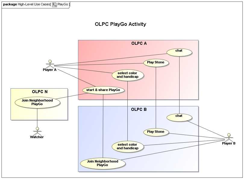 The PlayGo object is derived from Sugar's Activity object. Phase 1 of PlayGo implements the communication callbacks for playing and watching a Go game over the network with a member of your neighborhood.