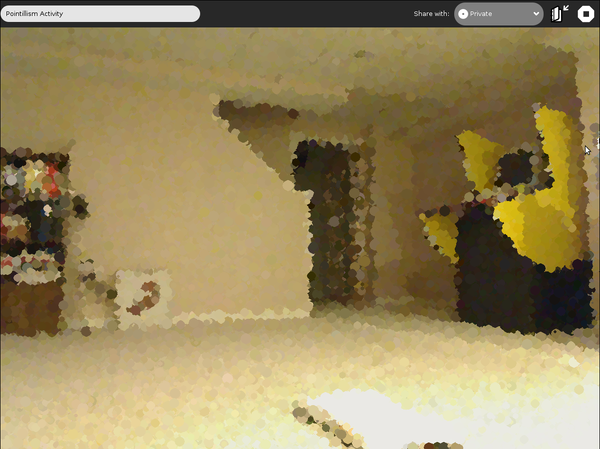 Pointillism is a simple activity that demonstrates the camera module in pygame, the result of a GSoC 2008 project. It displays live video from the camera in the style of pointillism. Clicking the Save/Keep icon saves the image to the journal.