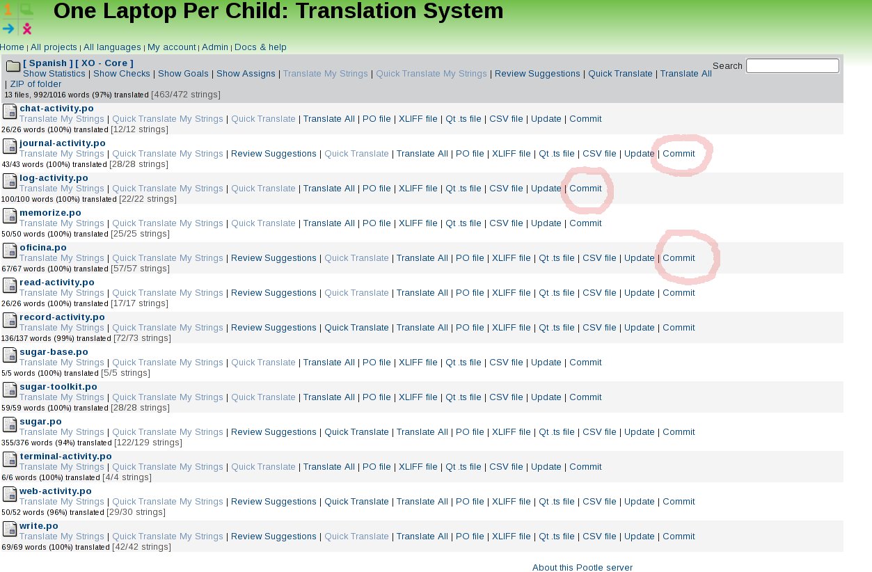 Once the Show Editing Functions link is activated, click on the "Commit" link below each PO file you want to commit.