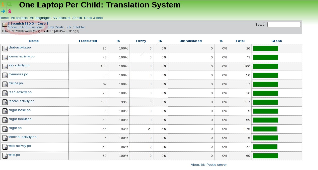 Pootle administrators have extended privileges over normal translators. They can grant or revoke permissions for normal Pootle registered users on a project wide basis, and can also add other administrators for their particular project. Note that administrators are specific to the combination of project and language, which means that [ Spanish ] [ XO - Core ] can have a totally different set of administrators and privileged users than [ Spanish ] [ XO - Bundled ], or of course, [ Amharic ] [ XO - Core ].