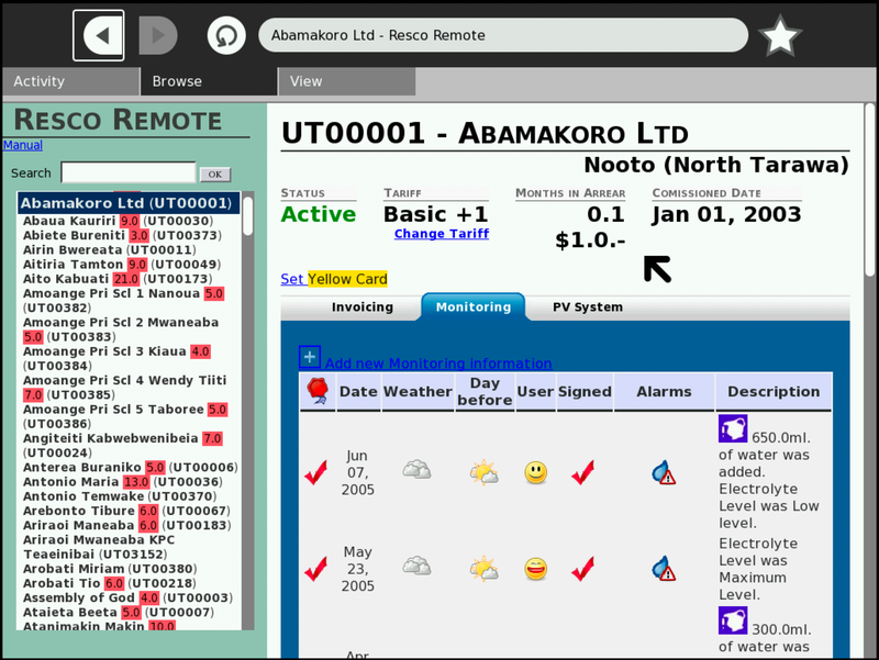 Work on the design of RESCO Manager started in 2001, as part of the EU funded project “Solar Energy for the Outer Islands” and it was first implemented at the Kiribati Solar Energy Company (KSEC) in 2005. Then, in July 2007 a second phase began with the aim of creating a web based application that could become an open source standard for managing the technical, financial and logistics aspects of renewable energy service companies (RESCOs). The software application is called RESCO Manager and it is currently under development.