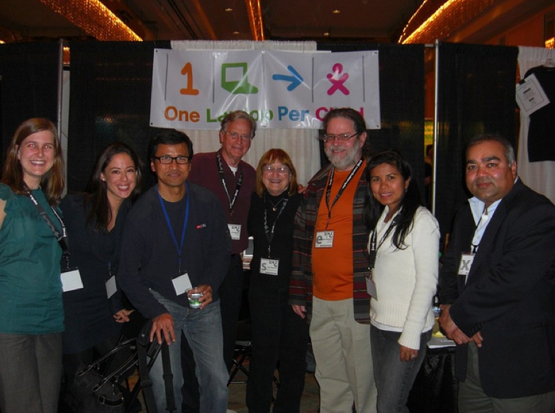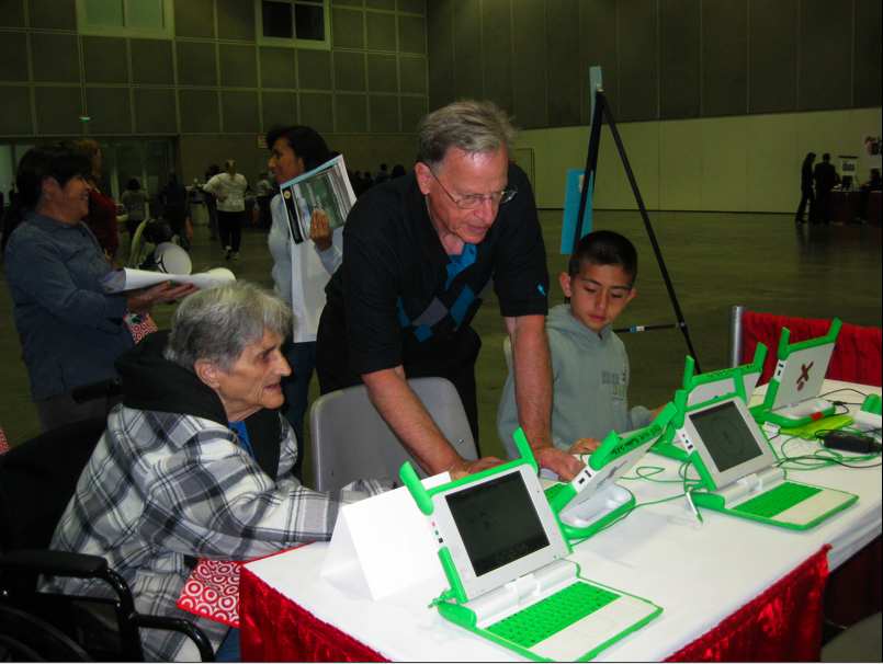 Volunteer Ed Bigenho helps a grandmother learn about the XO, OLPC and Sugar.