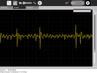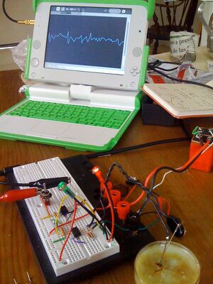 Experiments require data to be collected, and the neural activity can be displayed on a computer screen via a microphone port on a laptop. Currently, we plan on using the Measure Oscilloscope software for the OLPC to allow this information to be stored to the XO for further analysis. An example of recordings made on a MAC PC is on the right.
