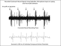 - The SpikerBox is then turned on. The neural signals are filtered and amplified, and students can listen to the neural activity through an internal speaker. The neural activity stems from the sensory neurons in the tiny wind-sensitive barbs on the leg of the cockroach. One can interact with the device by simply blowing on the leg and hearing a dramatic increase in the firing rate of spikes.