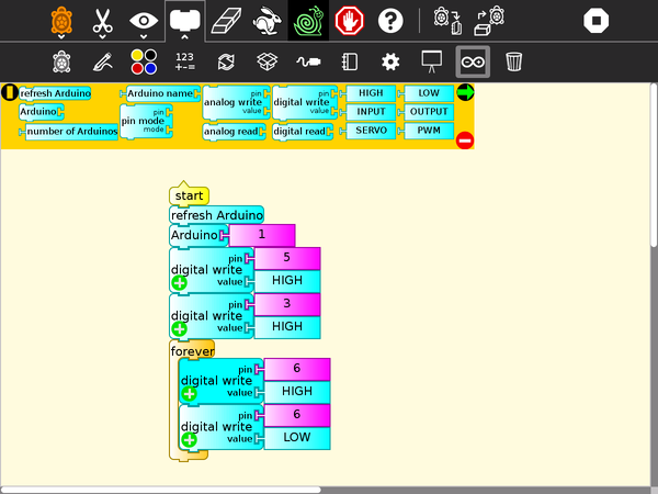 - drag a pin mode block into the main area, drag the OUTPUT block to the mode socket on the pin mode block,