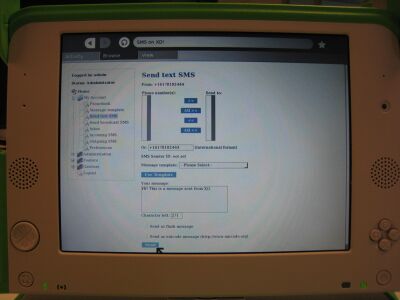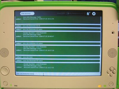 2. A modem/GSM AT Compliant mobile phone is connected with the XO acting as 'SMS Server'. Chat activity is used to send and receive messages. Other XOs present in the network can share the chat activity running on the XO acting as SMS Server.