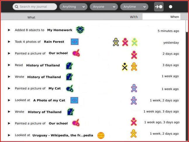 With previous Journal versions, I would click on the little arrow at the right of the entry to (re)launch the corresponding Activity, and click on the icon at the beginning (left) of the entry to call up to the "intermediate" screen (which could be used to enter meta-descriptions). Now these two are reversed - e.g., to (re)launch the Activity, click on its icon in the Journal entry. I agree with this change.