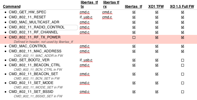 To determine the above matrix, we started with the command definitions defined in libertastf.h. We then did searches to collate these commands with where they appeared in libertastf and in both the XO1 Thin Firmware and the XO 1.5 Full Firmware. As expected, several commands that were added to the XO1 Thin Firmware were not present in the XO 1.5 Full Firmware. A big surprise however, was the command CMD_802_11_RF_TX_POWER which was defined in the header, supported by both firmwares, yet never implemented in libertastf.