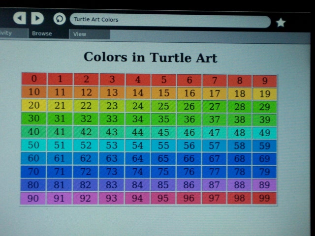 Here is a photograph of the Browser Activity on the XO displaying the original website for the preceding image. It should be taken with a large grain of salt, since it is a photo of a laptop screen, and is thus a pretty poor way to reliably show colors. To see the colors available in Turtle Art, the original website should be viewed on an actual XO.