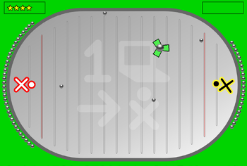 Spray Play is a physics-based action game based on the board game Crossfire. Players (represented by an XO character) aim their character at the puck and spray (or shoot) projectile circles at it, attempting to move the puck into the scoring area on their opponent's side of the playing field. Shot balls stay on the playing field and slide to a collection area behind the XO characters.