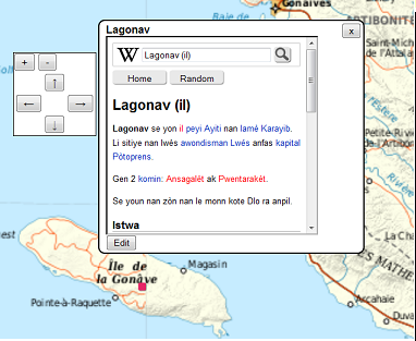 As with the Map activity, you can embed a Wikipedia article using codes such as wikiHT::Lagonav (il) and wikiFR::La Gonâve, but this requires internet access. If there is a WikiBrowse-Haiti in the works, it would be possible to link to those articles.