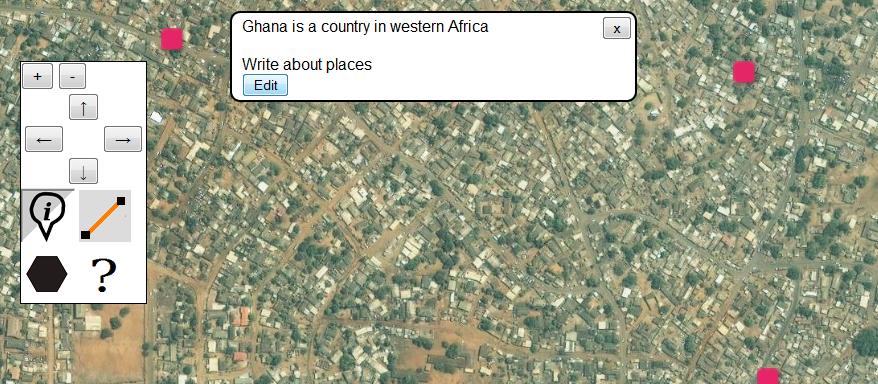 This activity is a test in developing a non-OLPC/Sugar complement to the Offline Map activity. The same code base and images can be used to add markers, lines, and shapes on another computer. Without the Sugar Activity, though, it is only HTML/JS and it is not currently possible to save maps or import KML / geodata.