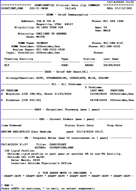 A Health Summary is a clinically oriented, structured report that extracts many kinds of data from VistA and displays it in a standard format. Health summaries can be printed or displayed for individual patients or for groups of patients. The data displayed covers a wide range of health-related information such as demographic data, allergies, current active medical problems, and laboratory results.