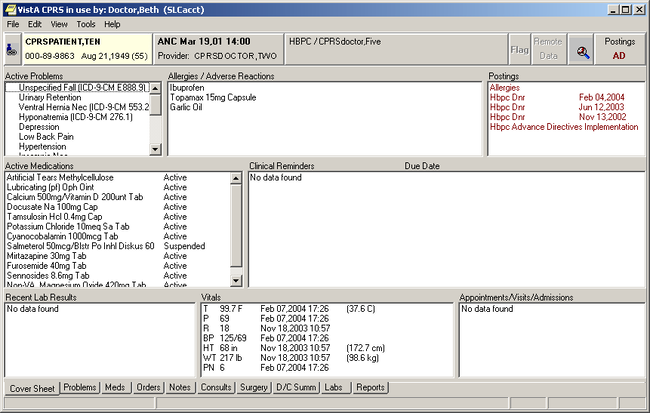 CPRS enables clinicians to enter, review, and continuously update all order-related information connected with any patient. With CPRS, you can order lab tests, medications, diets, radiology tests and procedures, record a patient's allergies or adverse reactions to medications, request and track consults, and enter progress notes, diagnoses, and treatments for each encounter, and enter discharge summaries. Close integration with the Clinical Reminders and Text Integration packages allows better record keeping and compliance with Clinical Guidelines and medical record requirements.