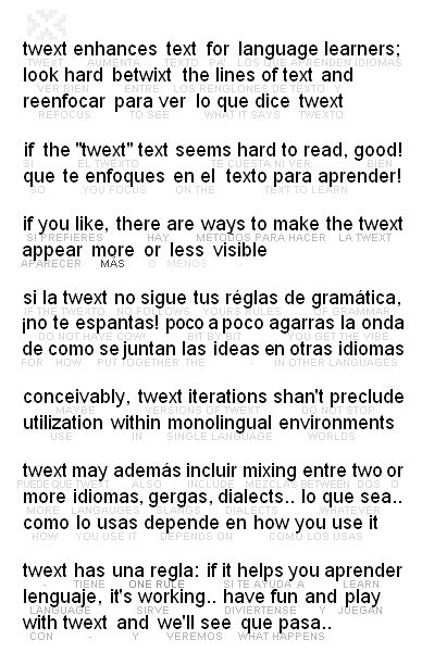 chunk methodtwext now can use a new method to associate chunks of text with chunks of translation.. the method works with regular text and also with lyrics to songs.. and may work between any of many languages: http://twext.com/method