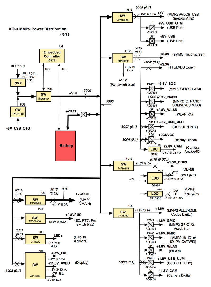 The following diagram attempts to illustrate the XO-3 power distribution network, as well as the tinderbox measurement points:
