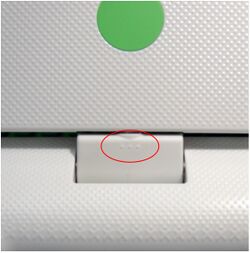 Externally identical to XO-1 with capacitive (single) touchpad, except for three raised dots on each side of the hinge cover: