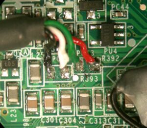 | Remove the heat shield. Route the USB cable around the memory and up to R392/R393 (above the VX855 companion chip). |
