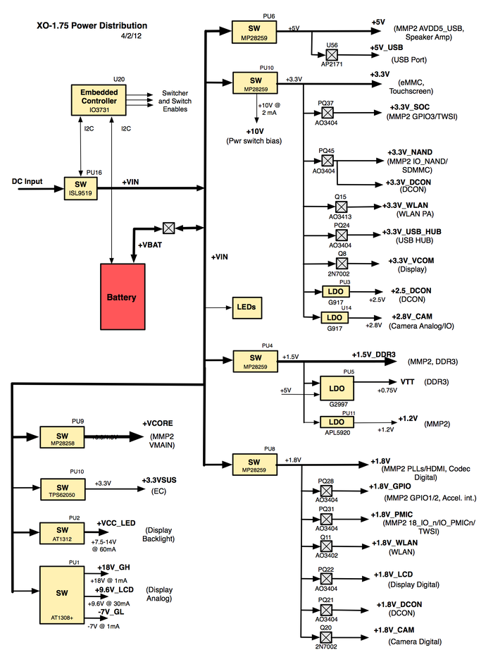 This page describes the power distribution network of the XO-1.75 laptop, specifically the production C2 version.