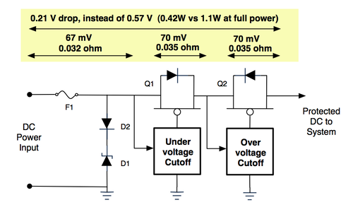 The biggest problem with the existing XO DC input protection circuitry is that it isn't very good at #1. Diode D1 presents a 0.4V voltage drop, which can waste up to 0.8W when initially charging a fully dicharged battery. One proposal is to replace D1 with another PMOS FET: