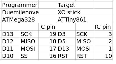 Pinout, using a Duemilanove as the programmer and XO Stick as the target