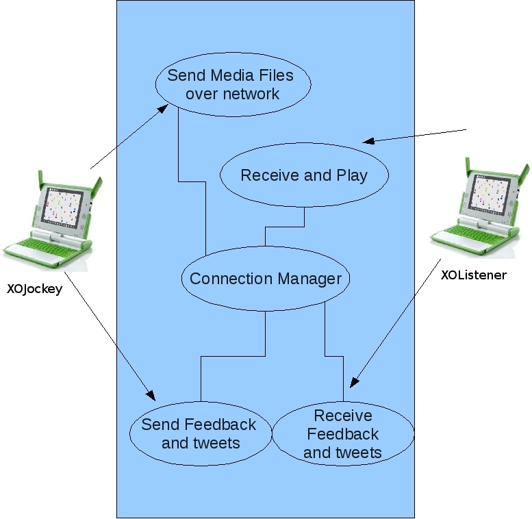 "" The XORadio would use the mic., music player(jukebox), wifi, telepathy, PyGTK. The above H/W and S/W would be used to implement a radio for the XO since the XO doesn't have a radio. It would lead to personalized radio channels on the XO mesh network. The XOJockey would broadcast himself/herself through the wlan/wifi component of the XO. The listeners would not only listen to the radio but would also act as nodes to extend the range of the radio/network. ""