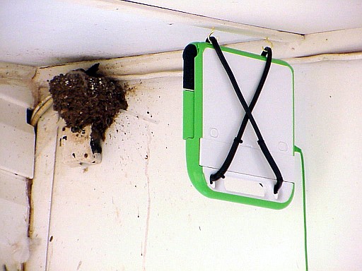 XO mounted to observe a birds nest using motion detection triggered snapshots. Image by Quozl. Was http://dev.laptop.org/~quozl/swallow-nest-one-mounting.jpg .
